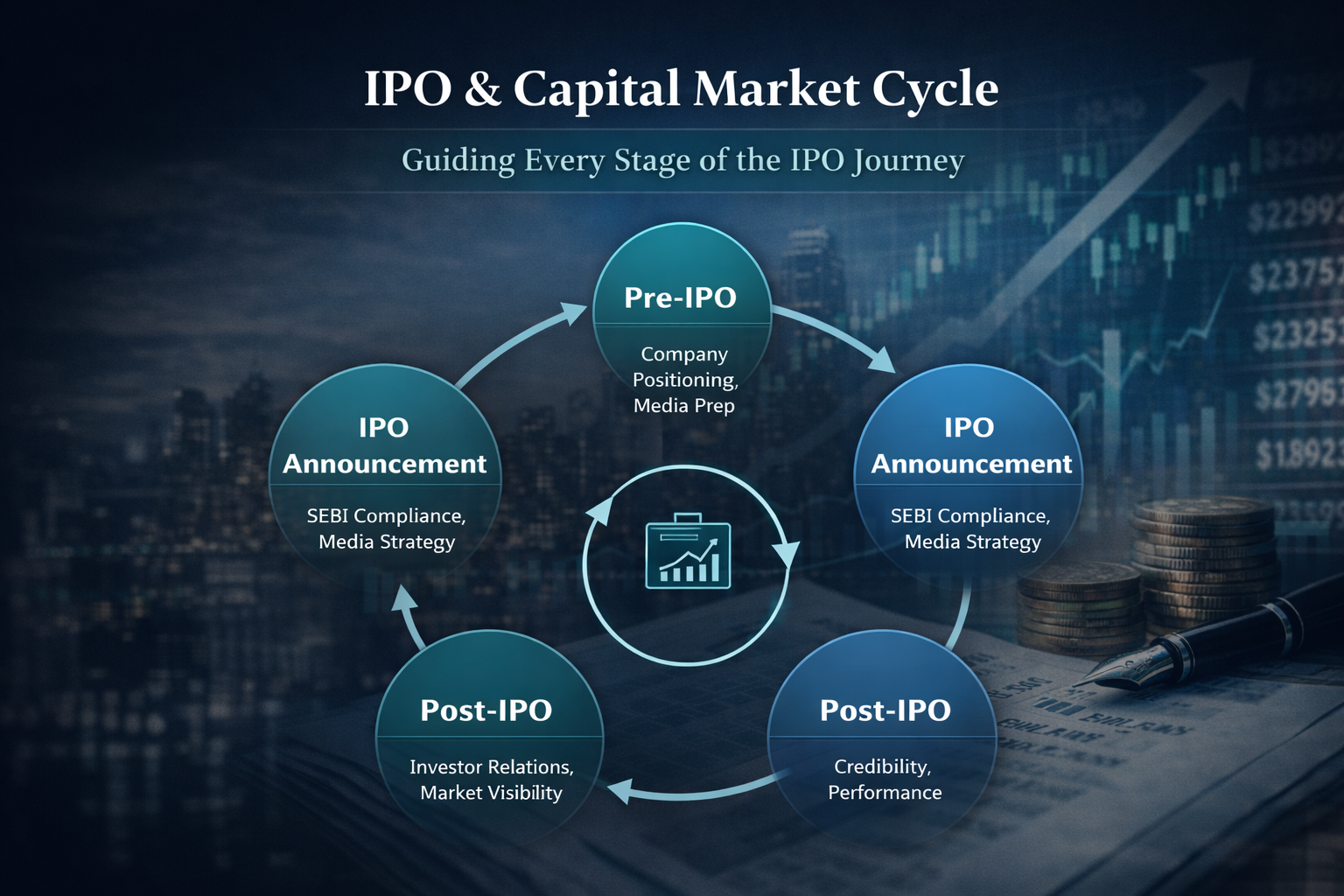 The IPO and capital market cycle begins in the pre-IPO phase, where companies focus on strategic positioning, governance readiness, and shaping a credible public narrative for investors and analysts. This is followed by the IPO announcement phase, where communication must align strictly with SEBI regulations while building awareness and confidence through structured financial media engagement. During the IPO launch, consistent, fact-based messaging supports investor understanding and market participation. Post listing, the focus shifts to post-IPO communication, strengthening credibility through performance updates, earnings communication, and transparent disclosures. The cycle continues with ongoing investor relations, ensuring sustained engagement, trust, and long-term value creation in the capital markets.